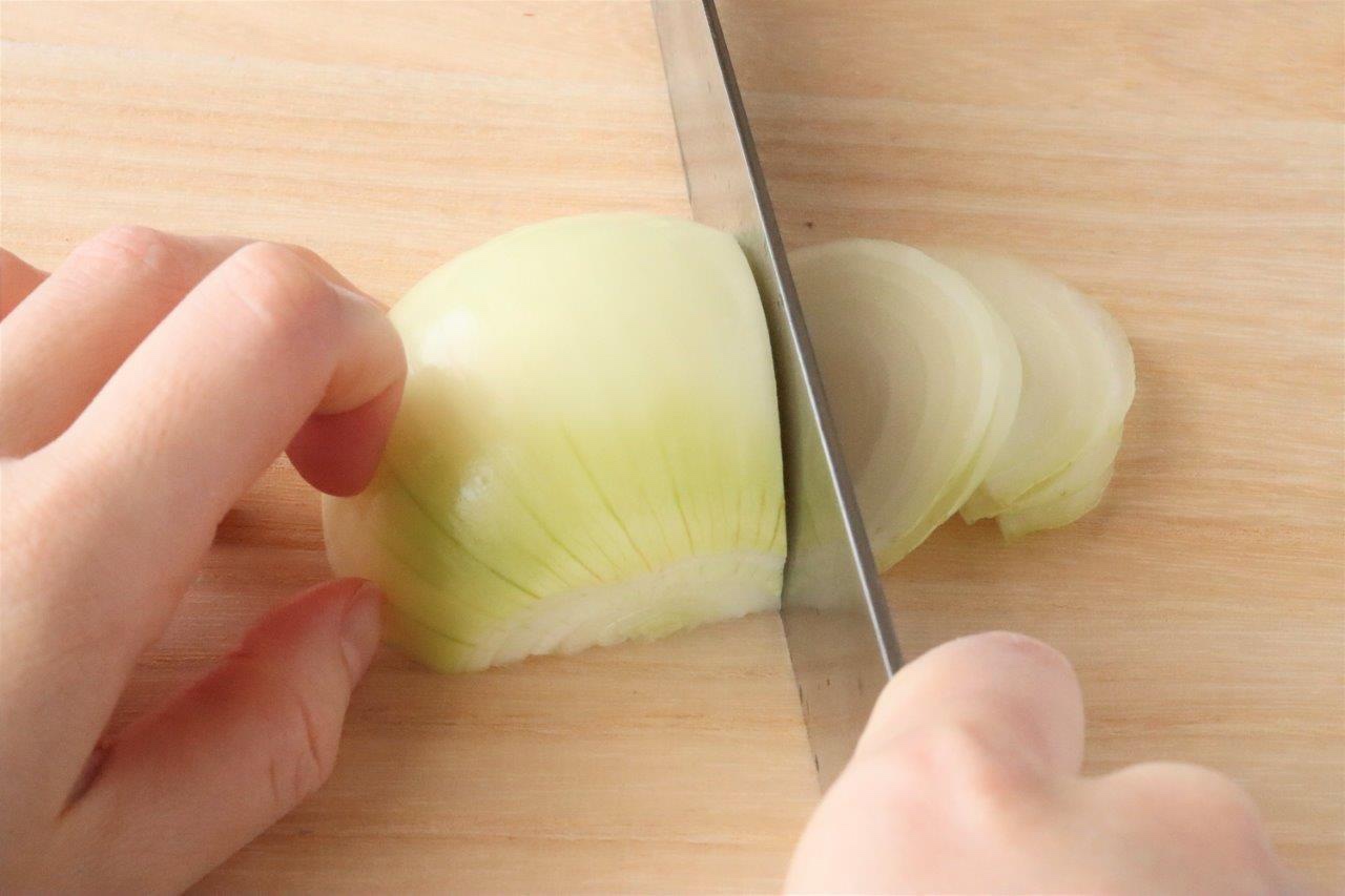 手順1 鶏胸肉の皮を剥ぎ、一口サイズに切る(気持ち小さめにすると火が通りやすくて🙆♂️)。玉ねぎを薄切り(下記画像の感じです!)にする。